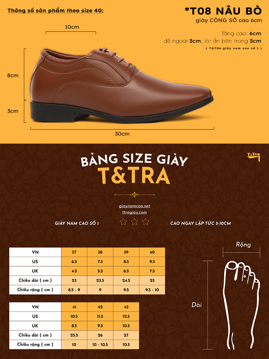 Giày tăng chiều cao nam T&TRA hân hạnh được phục vụ quý khách. Chúng tôi luôn luôn lắng nghe ý kiến đóng góp từ quý khách hàng để từ đó hoàn thiện tốt hơn. Sự tin tưởng của quý khách hàng là động lực phát triển của chúng tôi.
