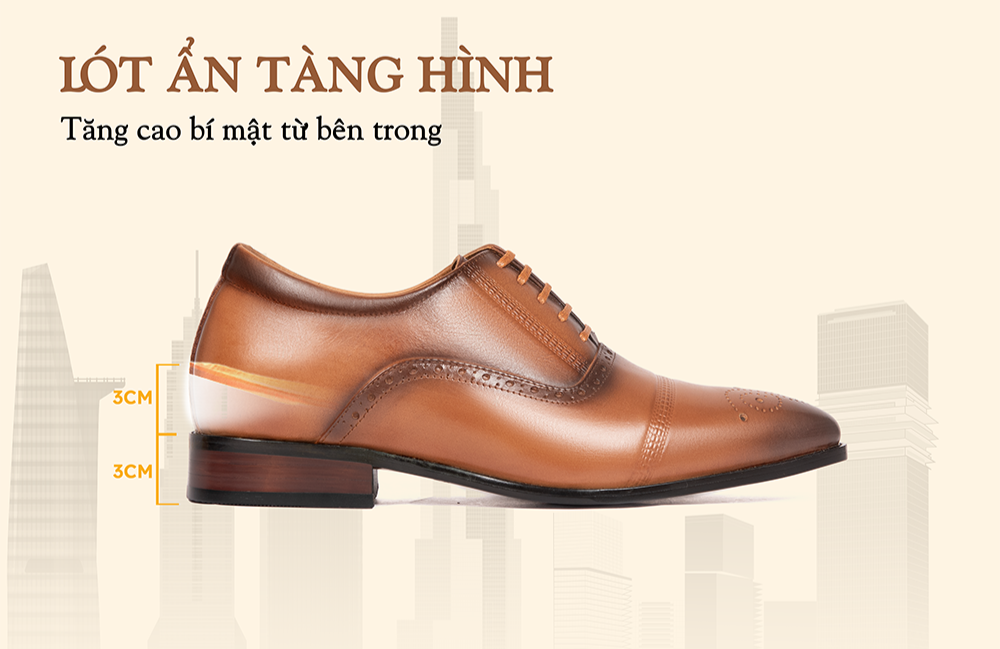 - Sản phẩm tích hợp tính năng tăng chiều cao kép gồm đế ngoài 3cm và lót ẩn 3cm, nâng tổng chiều cao lên đến 6cm