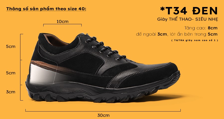 - Tăng cao 8cm: Đế ngoài 3cm, phần cao ẩn bên trong 5cm