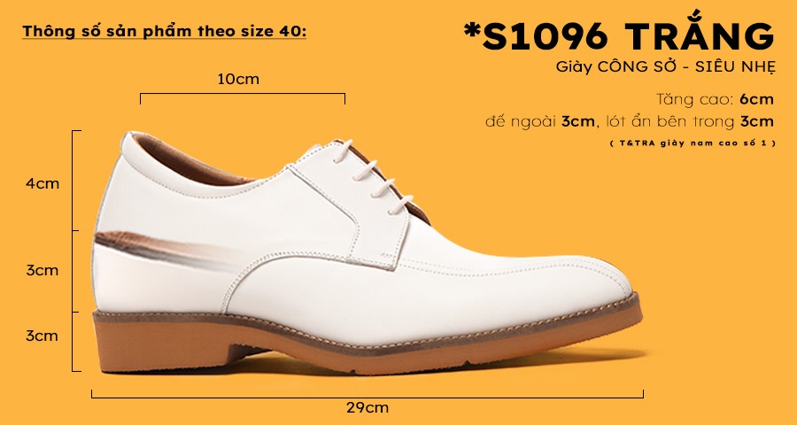 - Trọng lượng giày tăng chiều cao nam S1096 Trắng chỉ nặng khoảng 320gram/chiếc sẽ bằng với trọng lượng 1 chiếc dép do dùng đế và lót tăng cao bằng vật liệu siêu nhẹ EVA.