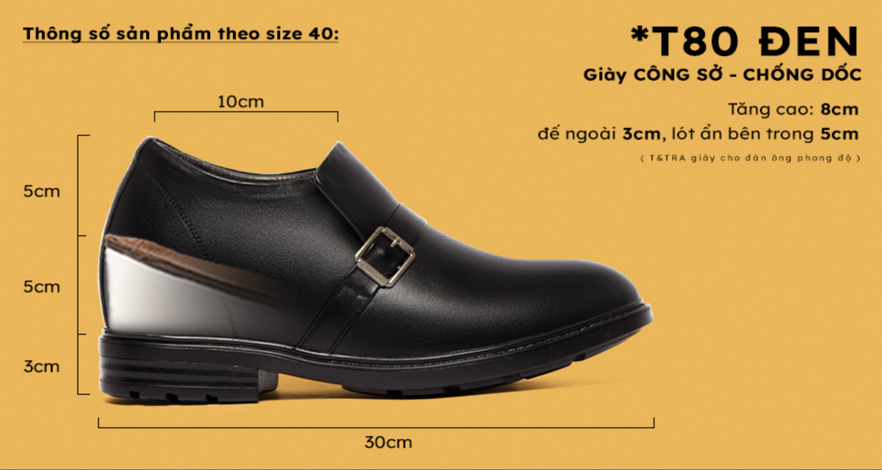 - Tăng cao 8cm: Đế ngoài 3cm, phần cao ẩn bên trong 5cm.
