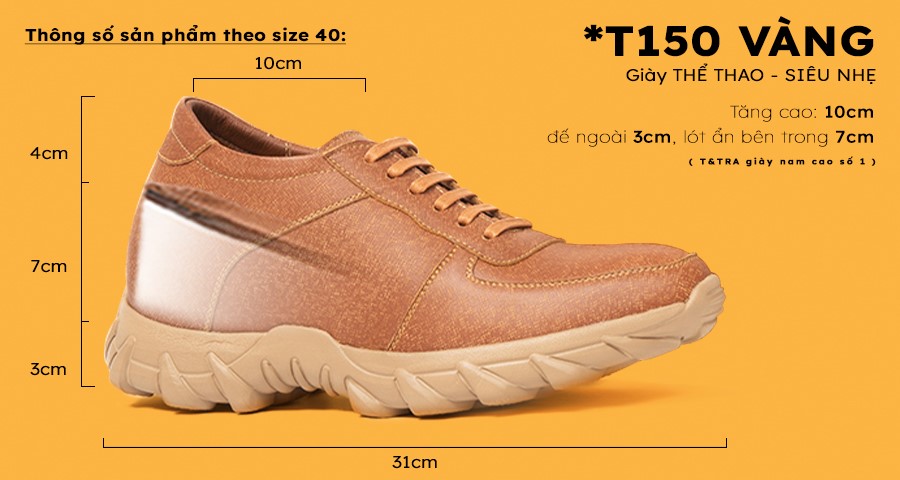 - Trọng lượng giày cao nam T150 Vàng nhẹ hơn 18% (so với dùng đế cao su) do dùng đế và lót tăng cao bằng vật liệu EVA.