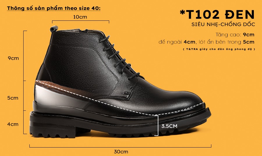- Trọng lượng giày cao cổ nam T102 Đen nhẹ hơn 23% (so với dùng đế cao su) do dùng đế dùng vật liệu siêu nhẹ EPDM và lót tăng cao bằng vật liệu siêu nhẹ EVA.