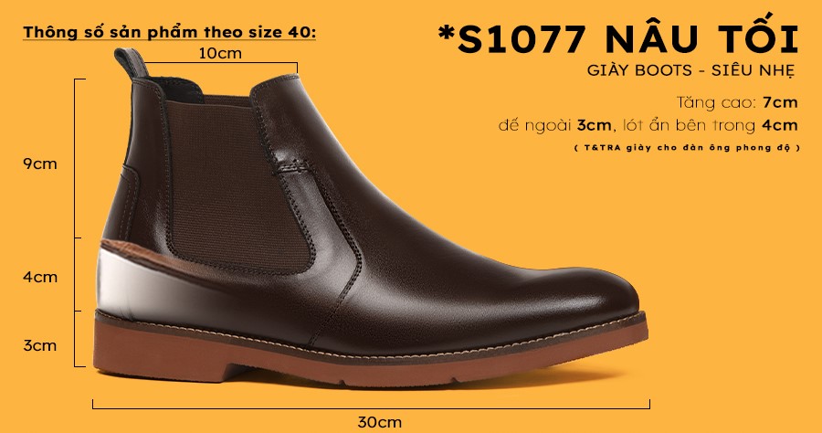 - Trọng lượng giày boots S1077 Nâu Đế Nâu chỉ nặng khoảng 320gram/chiếc sẽ bằng với trọng lượng 1 chiếc dép do dùng đế và lót tăng cao bằng vật liệu siêu nhẹ EVA.