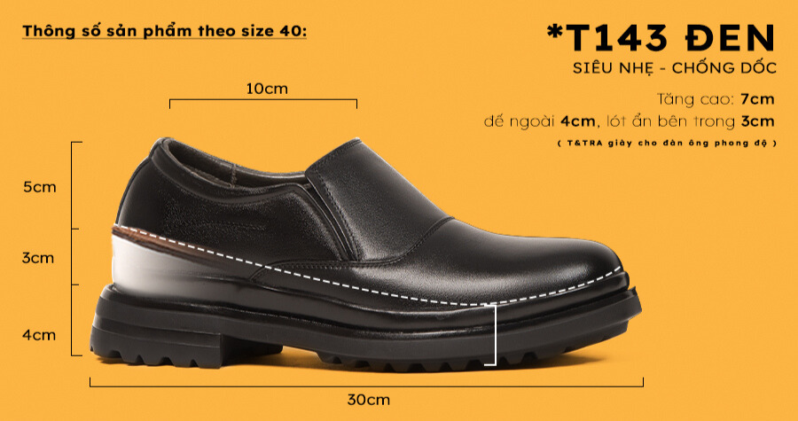- Điểm đáng quan tâm nhất khi sản xuất và sử dụng giày đế cao nam T143 Đen đế cao là độ dốc bàn chân khi sử dụng. Đặc biệt là những đôi giày có chiều cao lớn từ 8cm trở lên.