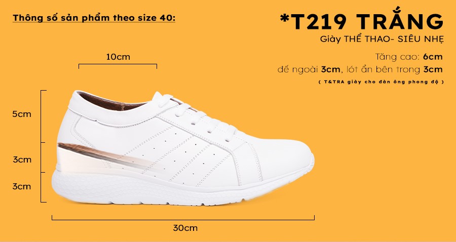- Trọng lượng giày cao nam T219 Trắng nhẹ hơn 18% (so với dùng đế cao su) do dùng đế và lót tăng cao bằng vật liệu EVA.