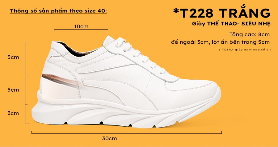 - Trọng lượng giày đế cao nam T228 Trắng nhẹ hơn 18% (so với dùng đế cao su) do dùng đế và lót tăng cao bằng vật liệu EVA.