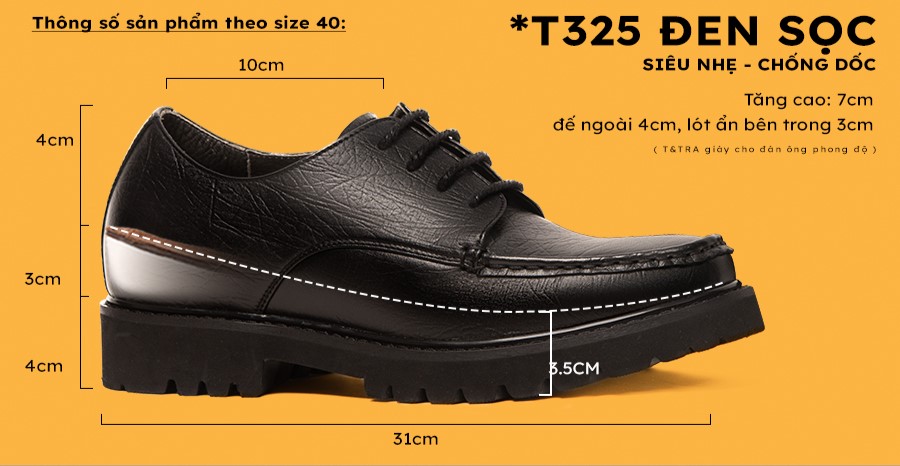 - Tăng cao 7cm: Đế ngoài 4cm, phần cao ẩn bên trong 3cm