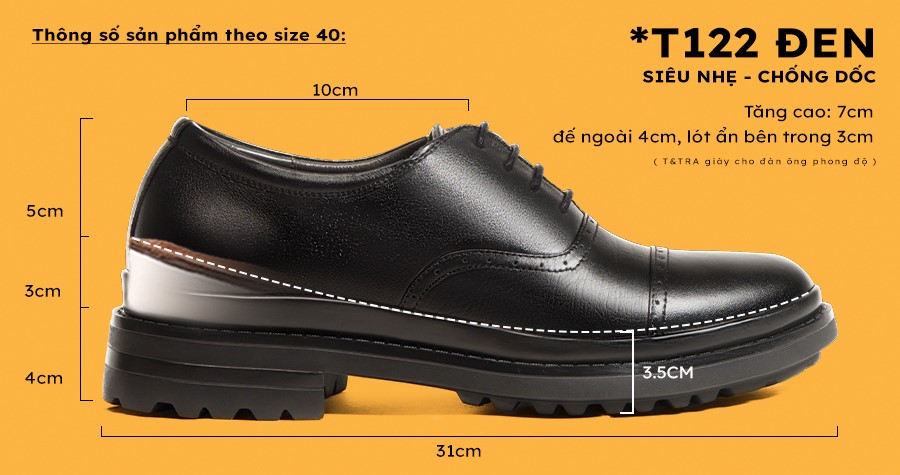 - Tăng cao 7cm: Đế ngoài 4cm, phần cao ẩn bên trong 3cm