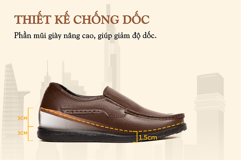 + Cao 5cm (đế ngoài 2cm và lót ẩn 3cm): độ dốc thấp, thích hợp với tần suất dùng mỗi ngày.