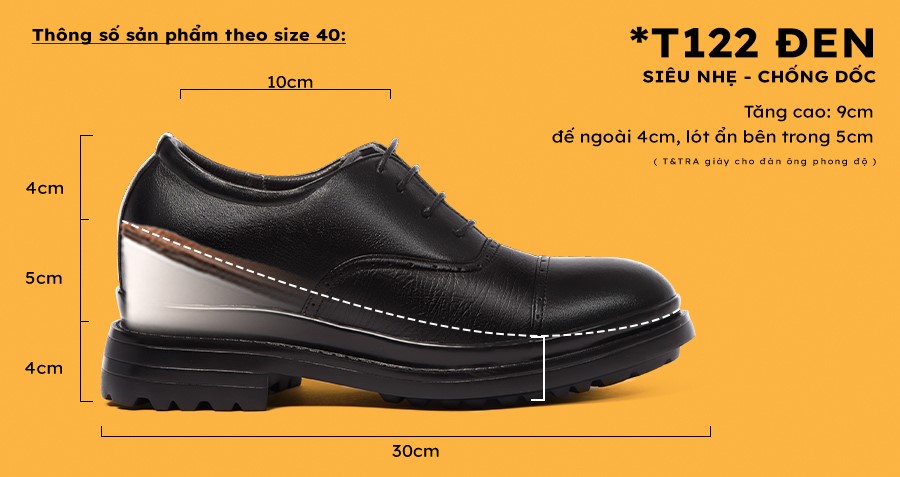 - Tăng cao 9cm: Đế ngoài 4cm, phần cao ẩn bên trong 5cm