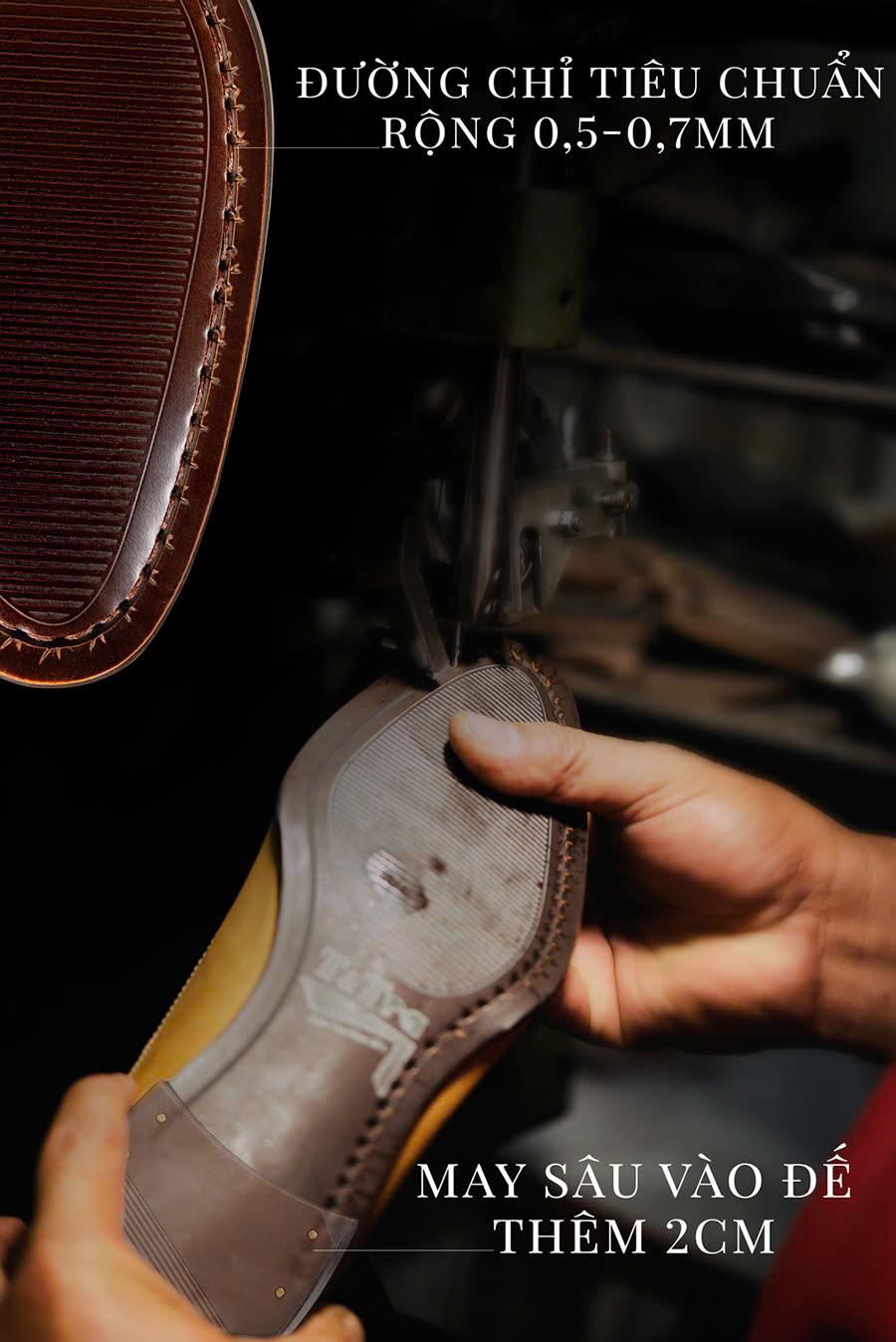 - Sử dụng công nghệ may Mckay để tăng cường sự liên kết giữa da và đế giày. Đường chỉ may theo tiêu chuẩn (khoảng cách mũi kim từ 0,5-0,7mm), may sâu vào phần gót giày 2cm.