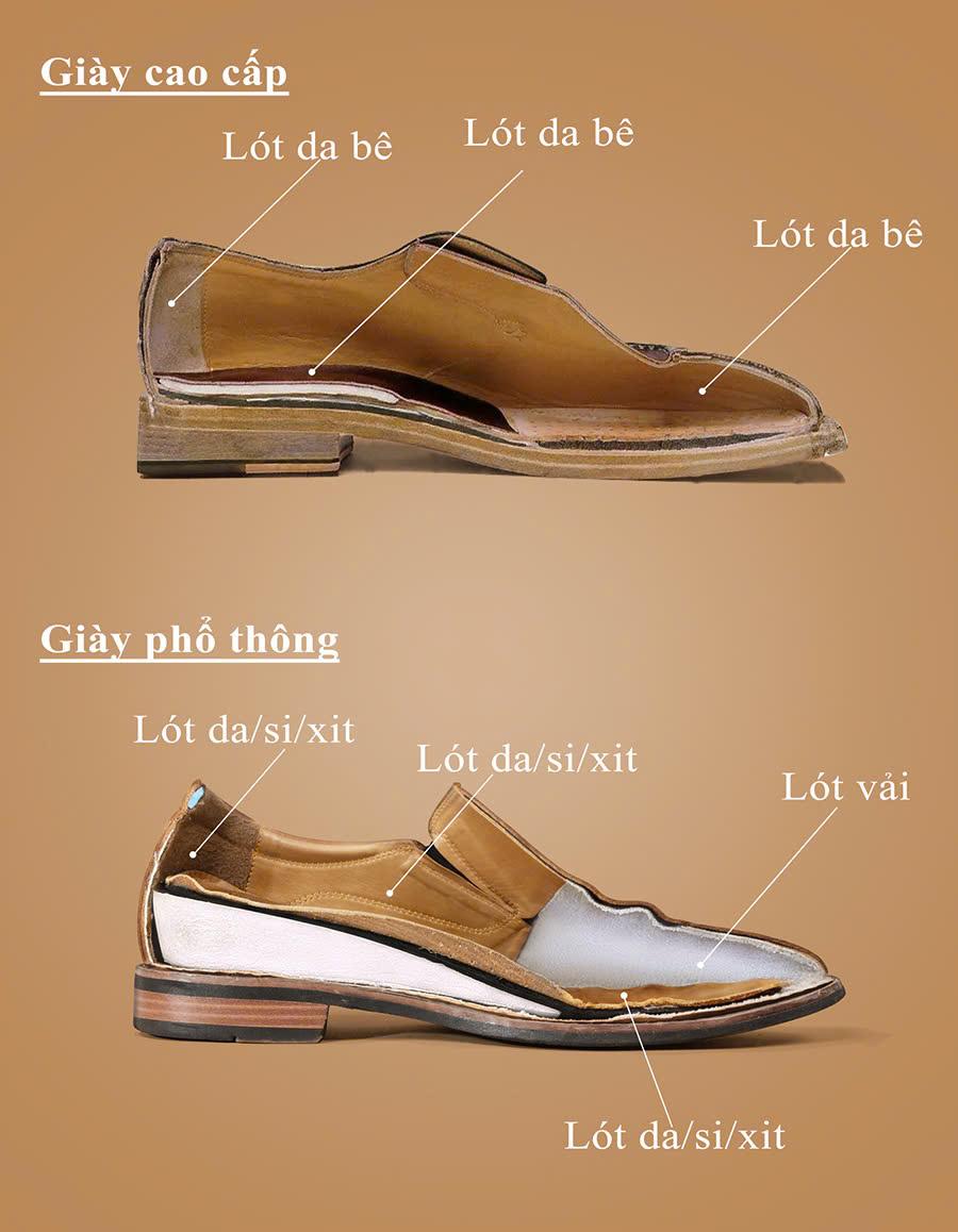 - Lót da bê toàn bộ bên trong giày giúp thấm hút mồ hôi và khử mùi tốt hơn (giày phổ thông phía trước lót vải - thấm hút mồ hôi kém hơn và không có khả năng khử mùi).