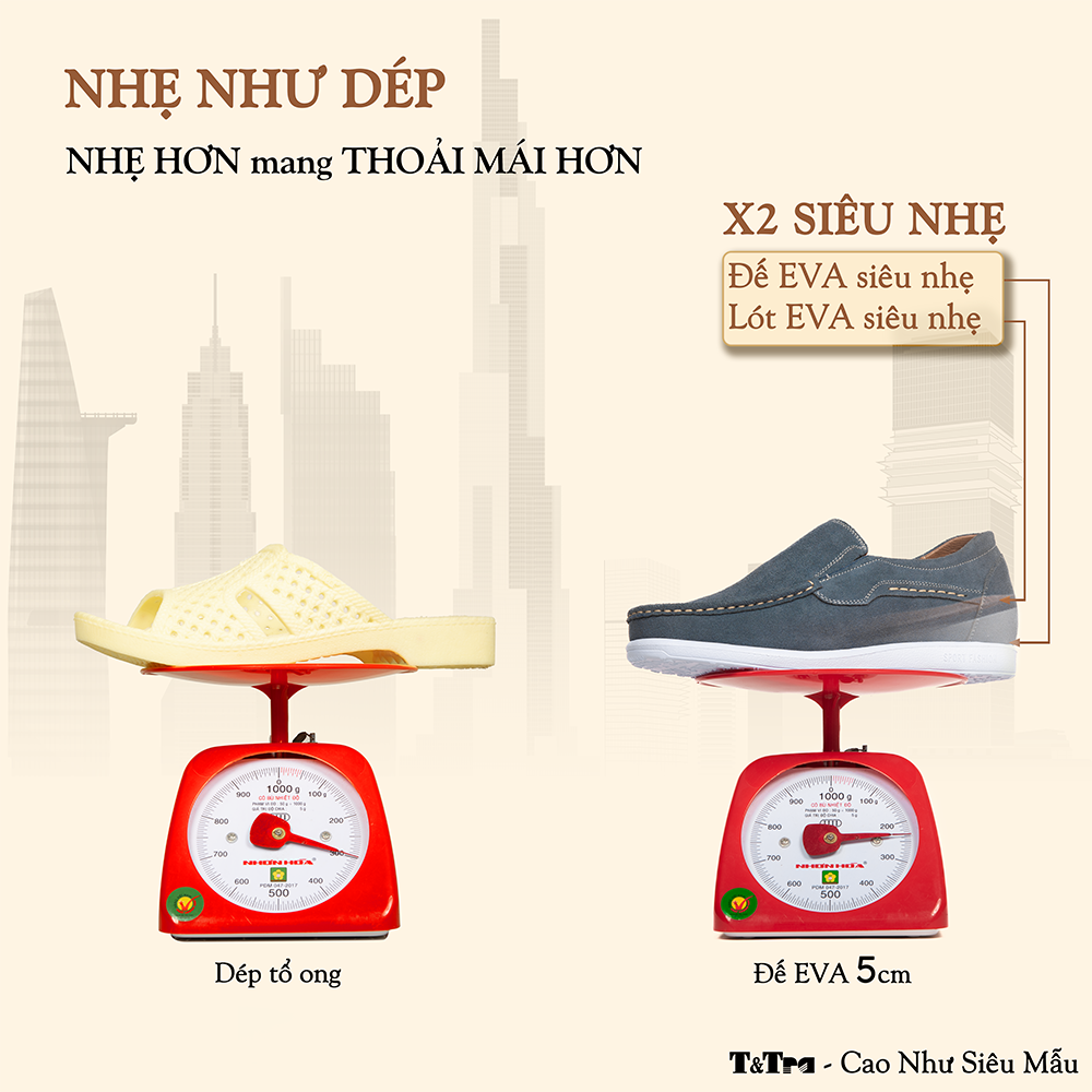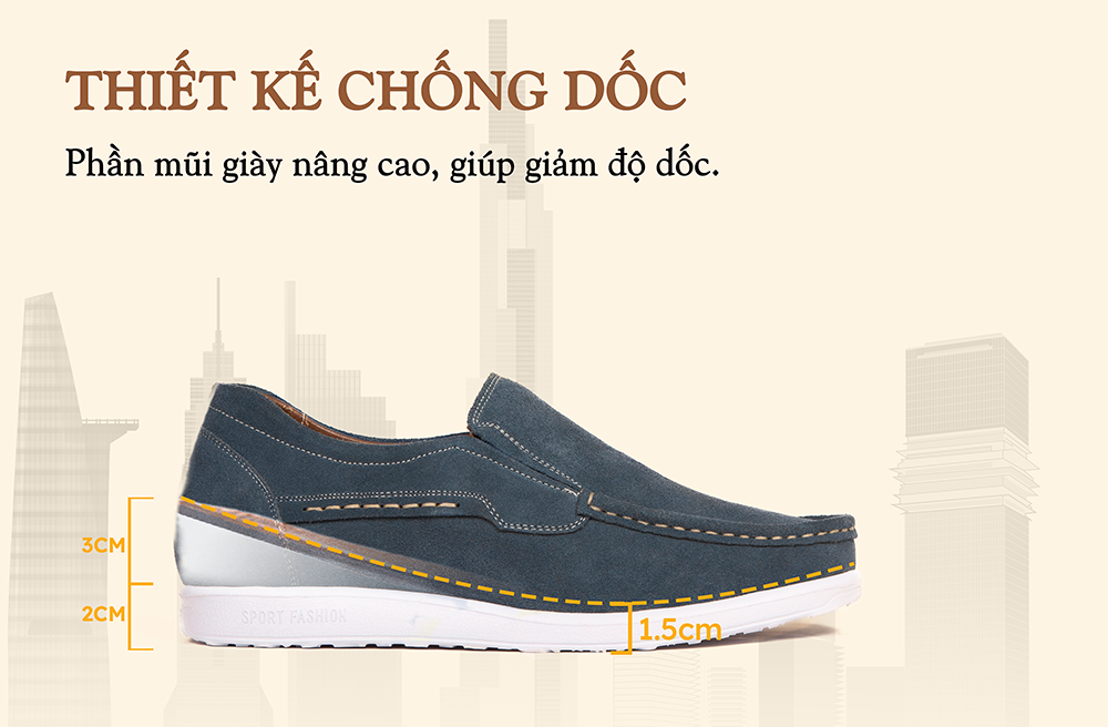 + Cao 5cm (đế ngoài 2cm và lót ẩn 3cm): độ dốc thấp, thích hợp với tần suất dùng mỗi ngày.