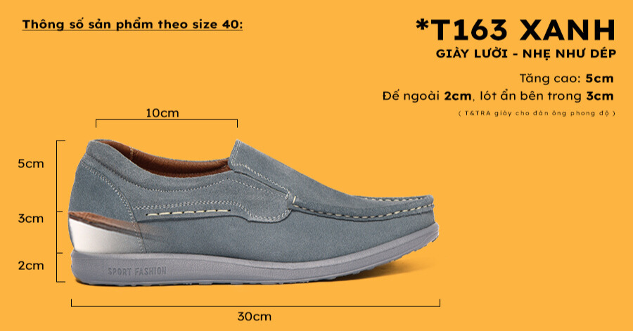 - Trọng lượng giày độn nam T163 Xanh chỉ nặng khoảng 250gram/chiếc sẽ bằng với trọng lượng 1 chiếc dép do dùng đế và lót tăng cao bằng vật liệu siêu nhẹ EVA.