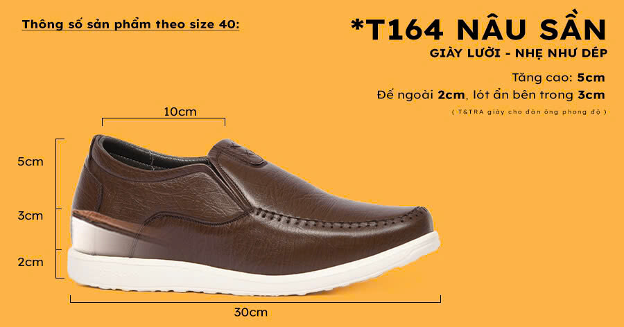 - Trọng lượng giày cao nam T164 Nâu Tối Sần chỉ nặng khoảng 250gram/chiếc sẽ bằng với trọng lượng 1 chiếc dép do dùng đế và lót tăng cao bằng vật liệu siêu nhẹ EVA.