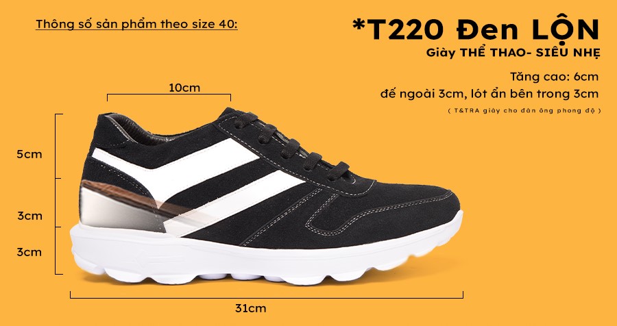 - Trọng lượng giày cao nam T228 Đen Lộn nhẹ hơn 18% (so với dùng đế cao su) do dùng đế và lót tăng cao bằng vật liệu EVA.
