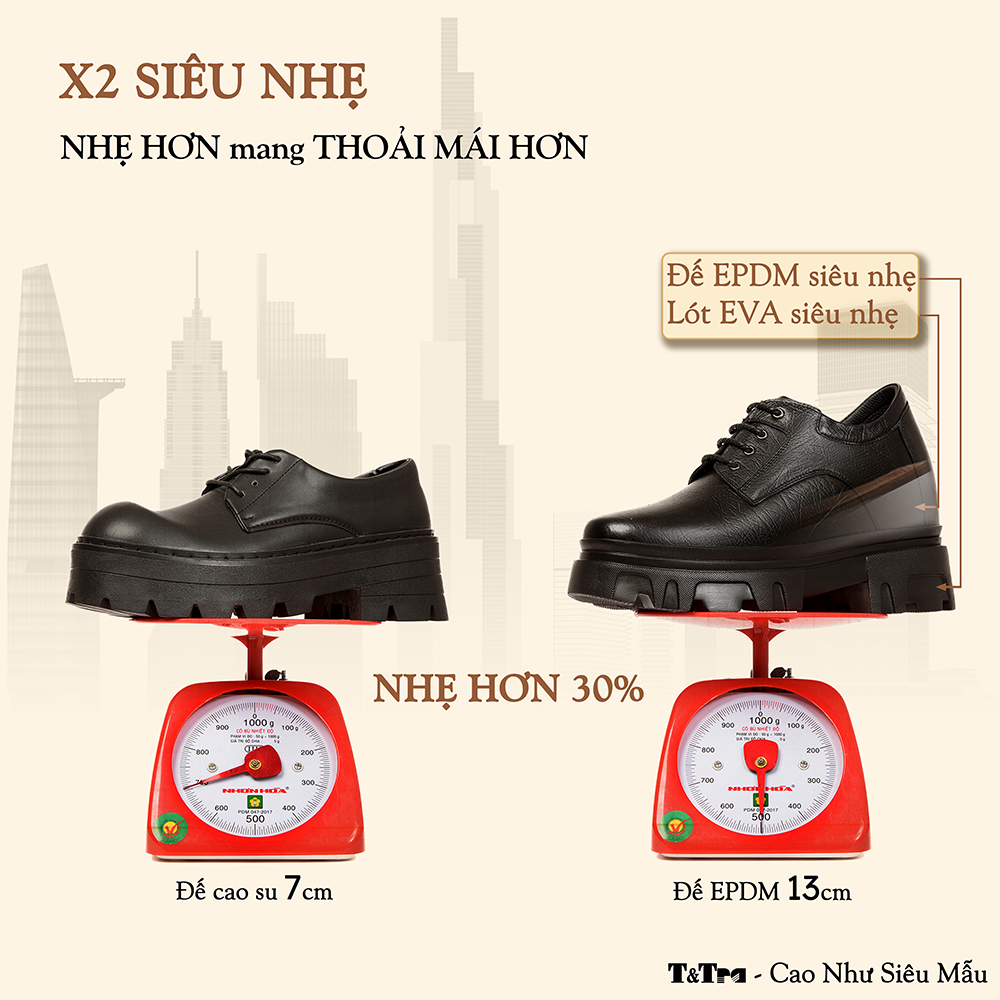 - Nhân đôi siêu nhẹ nhờ: đế EPDM siêu nhẹ và lót tăng chiều cao siêu nhẹ EVA. Giúp giày nhẹ hơn 30% so với giày đế cao su thông thường.