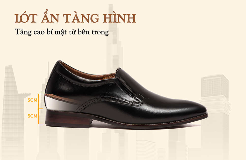 - Sản phẩm tích hợp tính năng tăng chiều cao kép gồm đế ngoài 3cm và lót ẩn 3cm, nâng tổng chiều cao lên đến 6cm