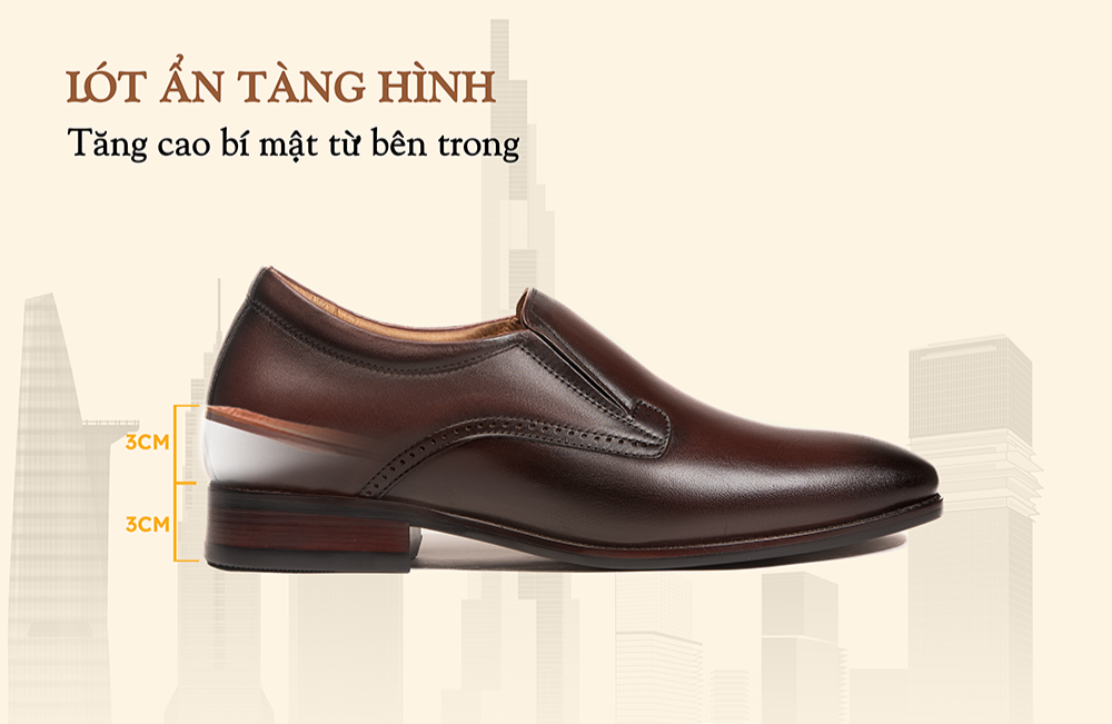- Sản phẩm tích hợp tính năng tăng chiều cao kép gồm đế ngoài 3cm và lót ẩn 3cm, nâng tổng chiều cao lên đến 6cm