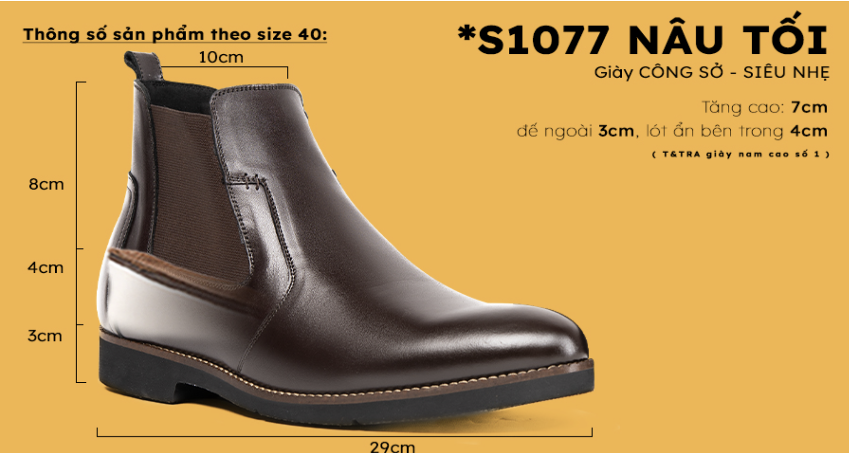 - Tăng cao 7cm: Đế ngoài 3cm, phần cao ẩn bên trong 4cm.