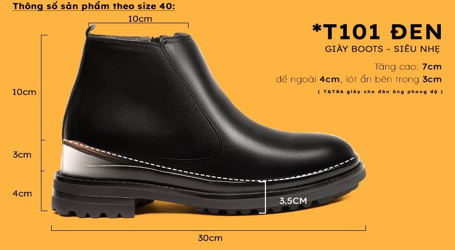 - Trọng lượng Giày Boots Nam T101 Đen nhẹ hơn 23% (so với dùng đế cao su) do dùng đế dùng vật liệu siêu nhẹ EPDM và lót tăng cao bằng vật liệu siêu nhẹ EVA.