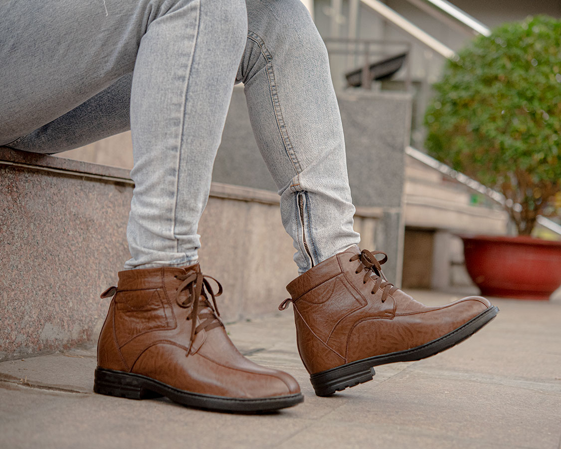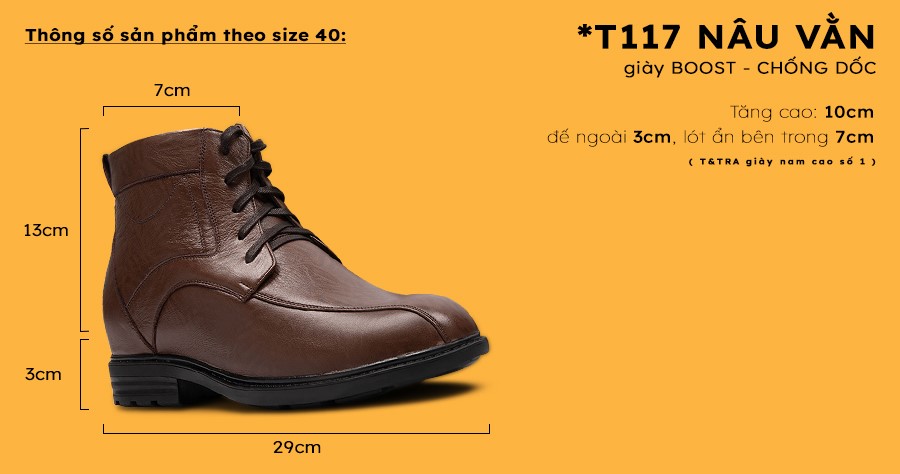 - Điểm đáng quan tâm nhất khi sản xuất và sử dụng giày boots nam T117 Nâu Vằn là độ dốc bàn chân khi sử dụng. Đặc biệt là những đôi giày có chiều cao lớn từ 8cm trở lên.