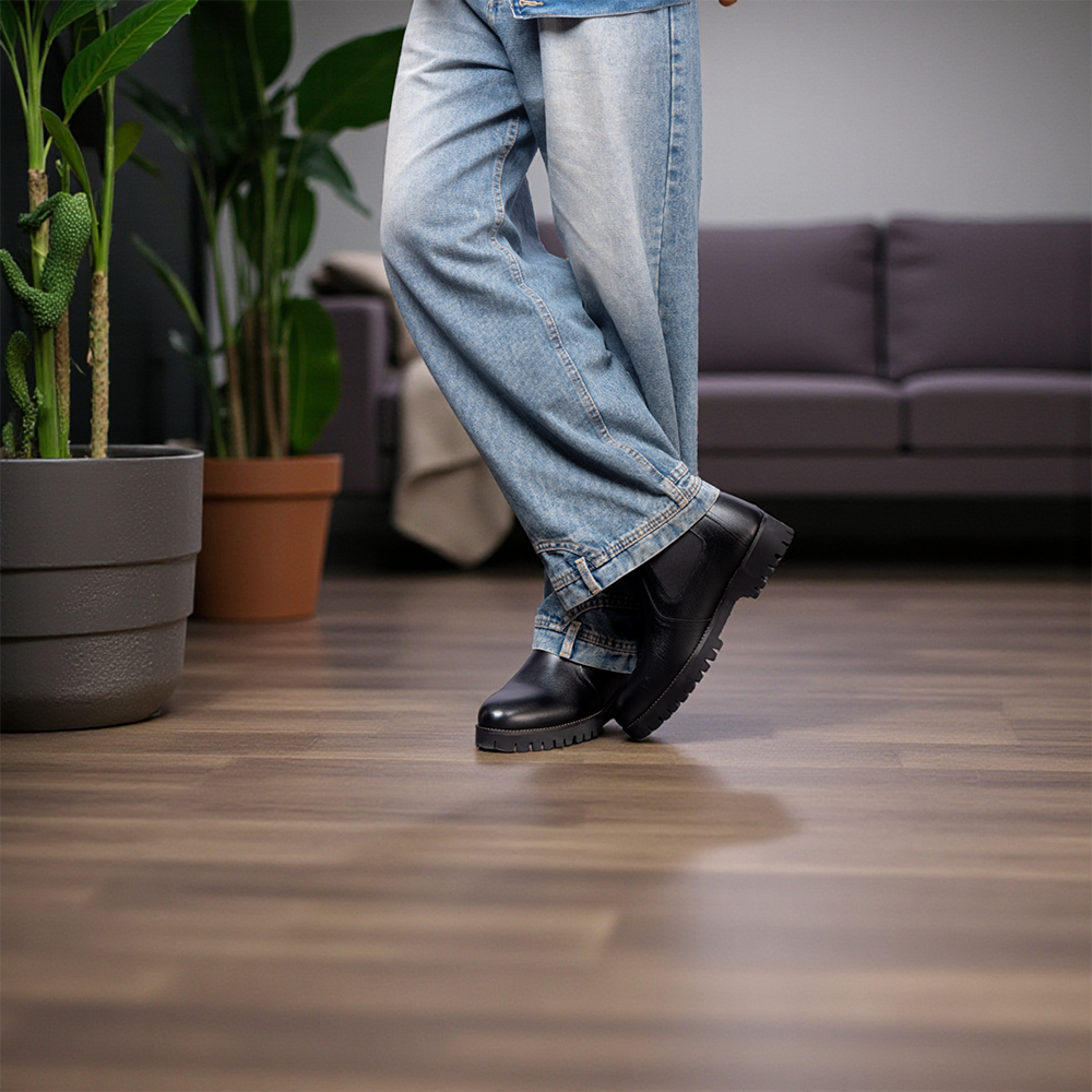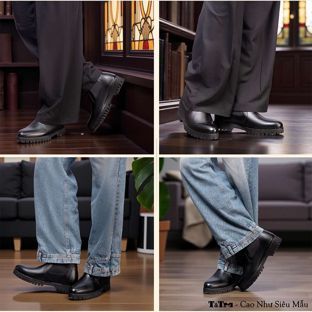 Giày Boots Nam T110 Đen - Màu: Đen - Chất liệu:    + Đế: Cao su đúc.    + Quai: Da bò nappa cao cấp, dày 1,4-1,6mm.    + Lót tăng chiều cao: EVA siêu nhẹ không phân hủy    + Lớp lót đệm giày độc quyền T&TRA có tính đàn hồi cao    + Lót hông: Lót da - Tăng cao 10cm: Đế ngoài 3cm, phần cao ẩn bên trong 7cm - Thiết kế và sản xuất: T&Tra, Việt Nam - Công nghệ chống dốc: Độ dốc tương đương mẫu cao 8cm KHÔNG thiết kế chống dốc - Sản phẩm miễn phí ship toàn quốc