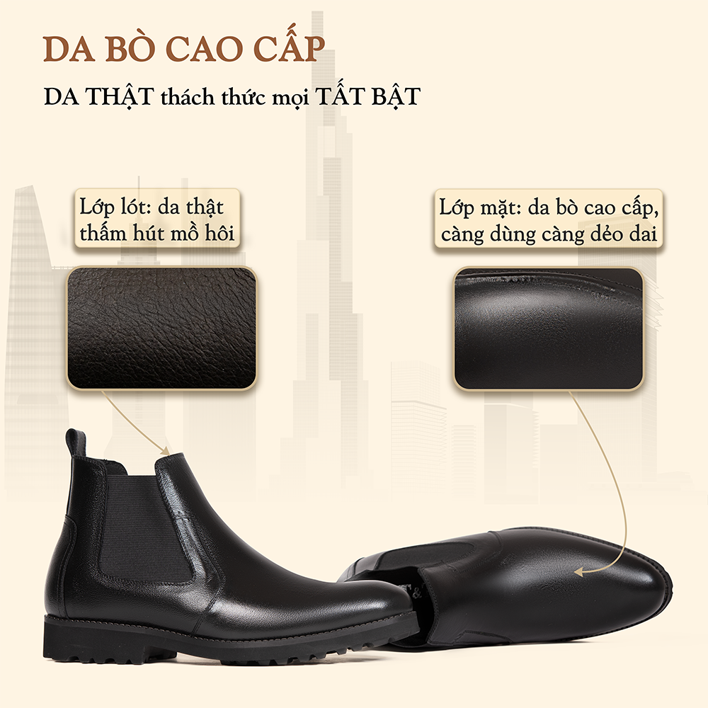 Giày Cao Nam T81 Đen - Màu: Đen - Chất liệu:    + Đế: Cao su đúc.    + Quai: Da bò nappa cao cấp, dày 1,4-1,6mm    + Lót tăng chiều cao: EVA siêu nhẹ không phân hủy.    + Lớp lót đệm giày độc quyền T&TRA có tính đàn hồi cao.    + Lót hông: Lót da. - Tăng cao 8cm: Đế ngoài 3cm, phần cao ẩn bên trong 5cm. - Thiết kế và sản xuất: T&TRA, Việt Nam. - Công nghệ chống dốc: Độ dốc tương đương mẫu cao 6cm KHÔNG thiết kế chống dốc. - Sản phẩm miễn phí ship toàn quốc.
