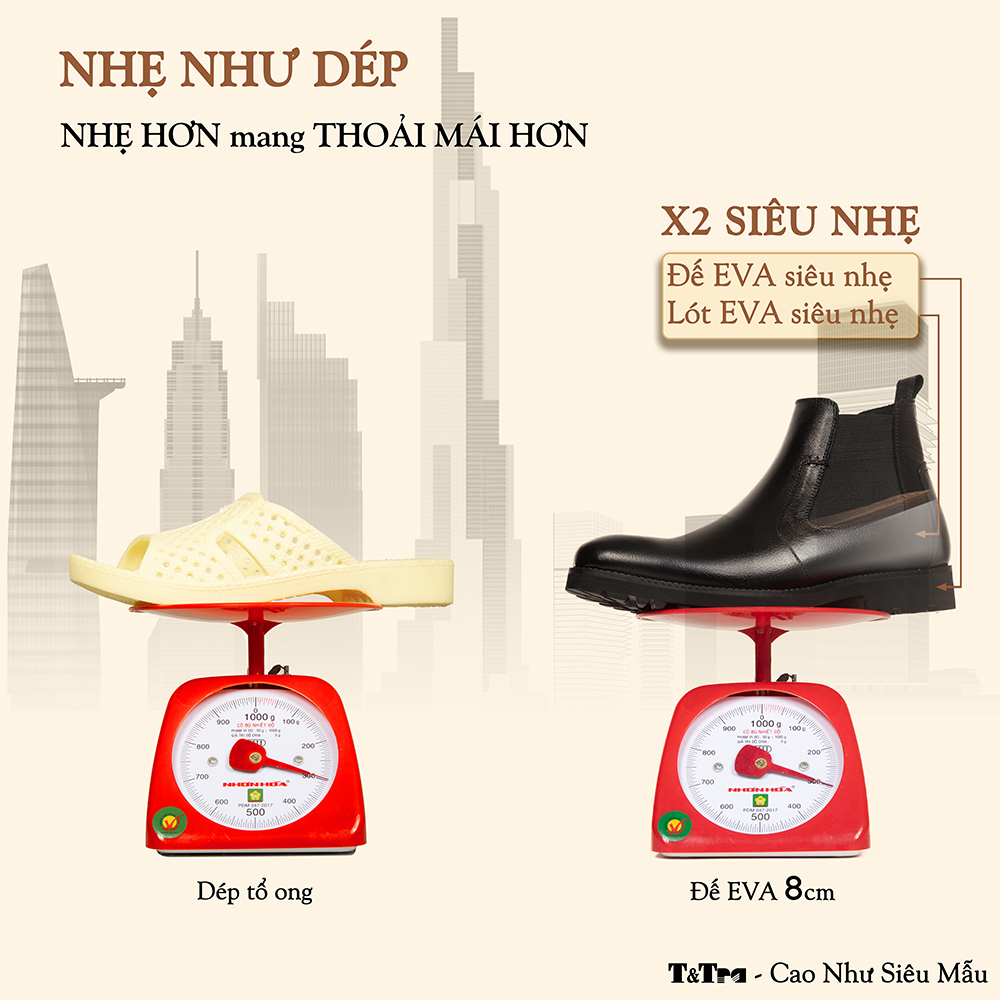 - Tăng cao 8cm: Đế ngoài 3cm, phần cao ẩn bên trong 5cm