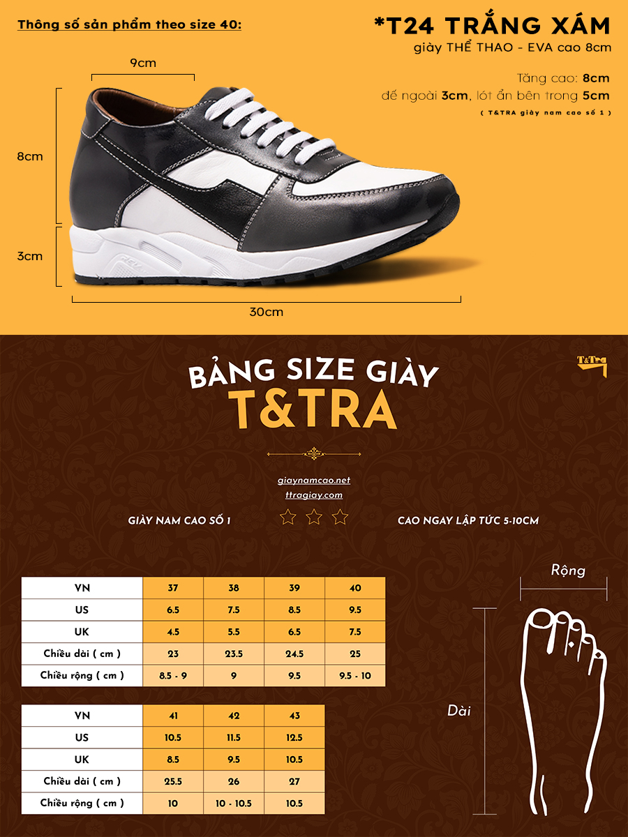 - Tăng cao: 8cm (đế ngoài 3cm, lót ẩn bên trong 5cm)