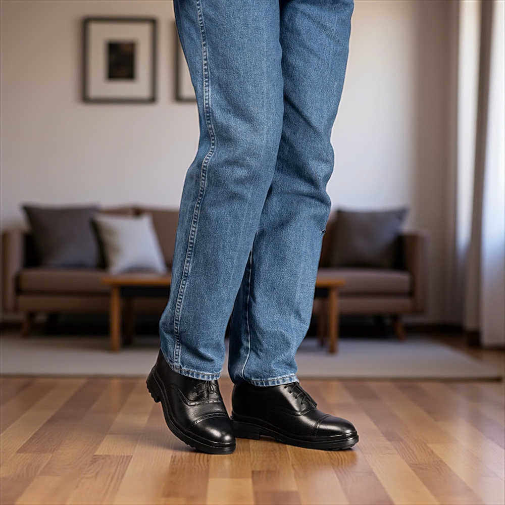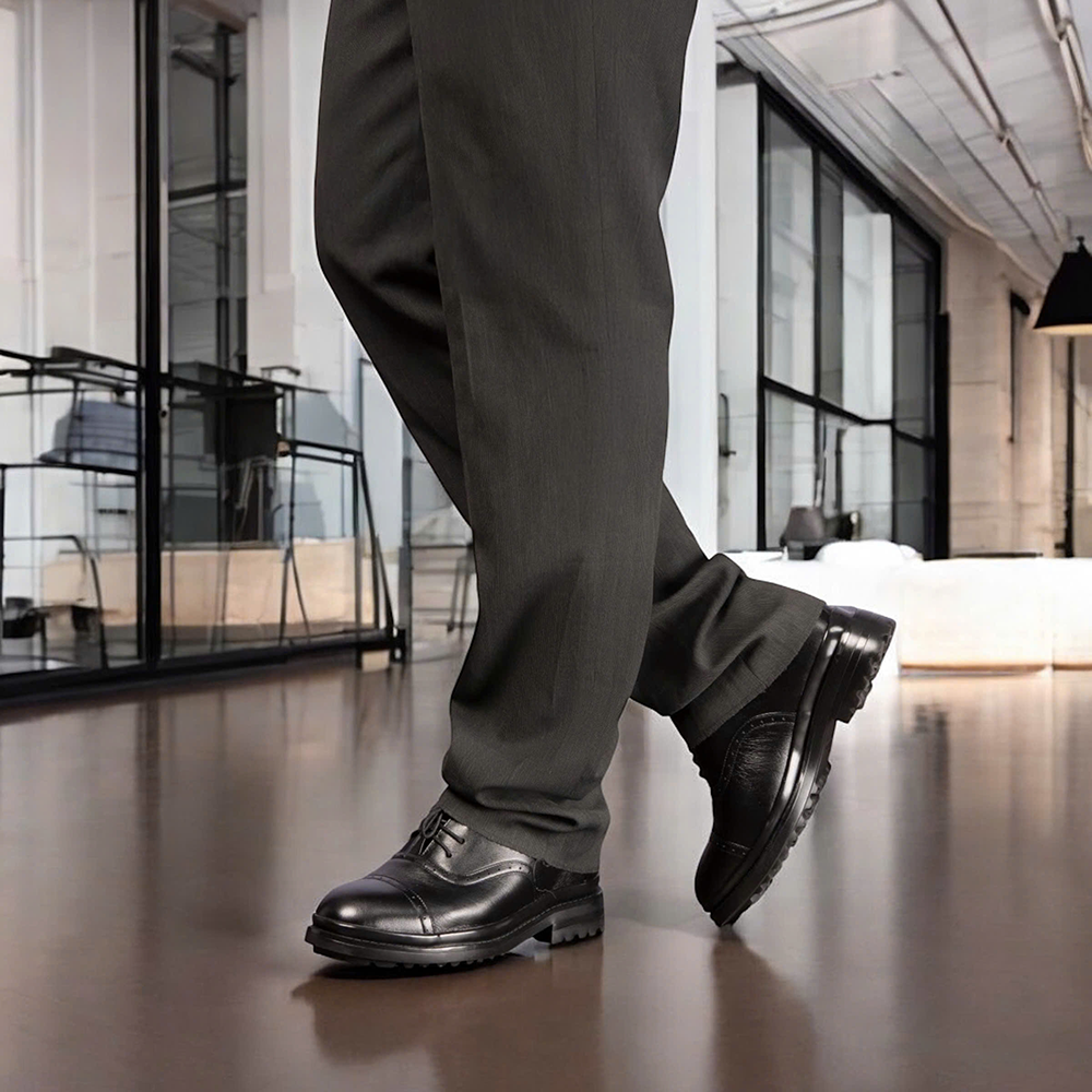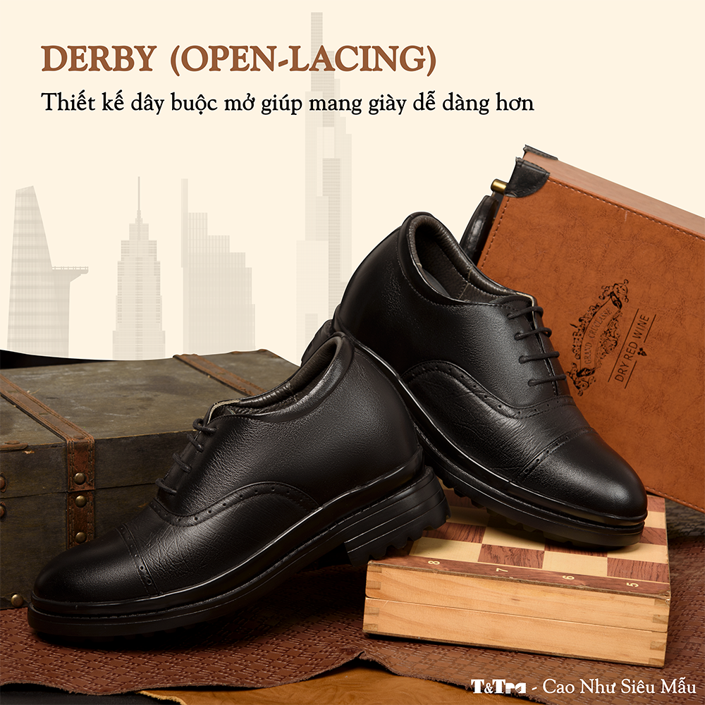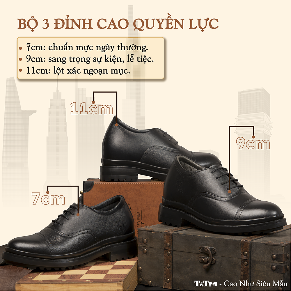 Giày Cao Nam T81 Đen - Màu: Đen - Chất liệu:    + Đế: Cao su đúc.    + Quai: Da bò nappa cao cấp, dày 1,4-1,6mm    + Lót tăng chiều cao: EVA siêu nhẹ không phân hủy.    + Lớp lót đệm giày độc quyền T&TRA có tính đàn hồi cao.    + Lót hông: Lót da. - Tăng cao 8cm: Đế ngoài 3cm, phần cao ẩn bên trong 5cm. - Thiết kế và sản xuất: T&TRA, Việt Nam. - Công nghệ chống dốc: Độ dốc tương đương mẫu cao 6cm KHÔNG thiết kế chống dốc. - Sản phẩm miễn phí ship toàn quốc.