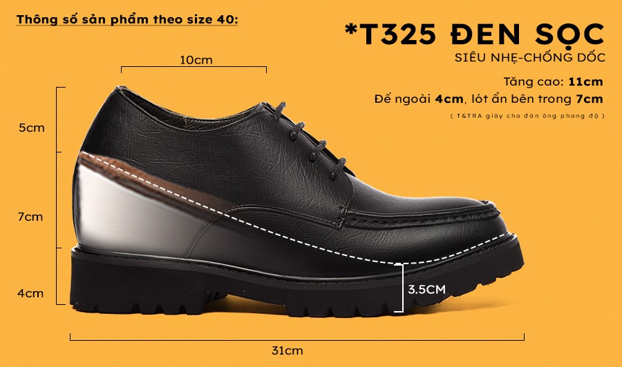 - Tăng cao 11cm: Đế ngoài 4cm, phần cao ẩn bên trong 7cm