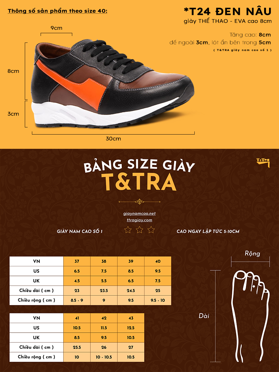 - Tăng cao: 8cm (đế ngoài 3cm, lót ẩn bên trong 5cm)