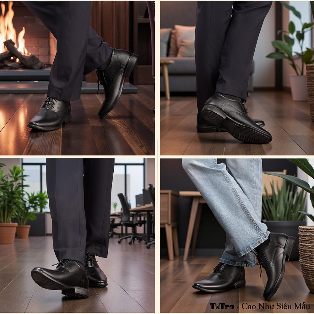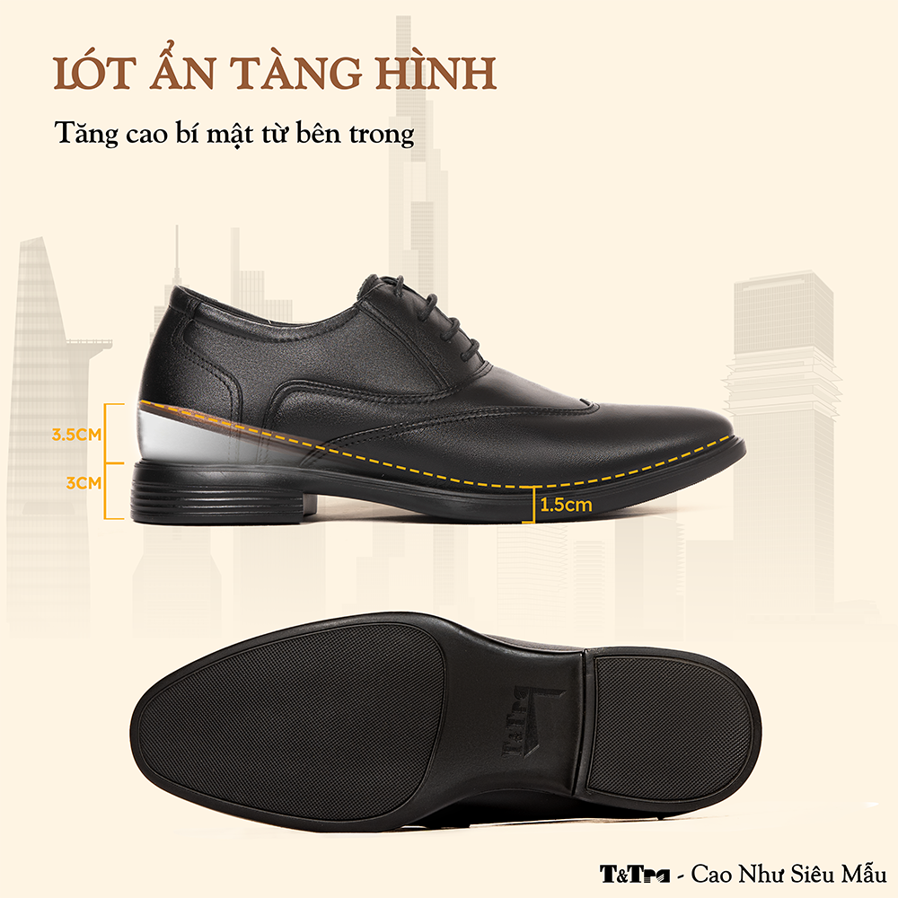 Giày Cao Nam T81 Đen - Màu: Đen - Chất liệu:    + Đế: Cao su đúc.    + Quai: Da bò nappa cao cấp, dày 1,4-1,6mm    + Lót tăng chiều cao: EVA siêu nhẹ không phân hủy.    + Lớp lót đệm giày độc quyền T&TRA có tính đàn hồi cao.    + Lót hông: Lót da. - Tăng cao 8cm: Đế ngoài 3cm, phần cao ẩn bên trong 5cm. - Thiết kế và sản xuất: T&TRA, Việt Nam. - Công nghệ chống dốc: Độ dốc tương đương mẫu cao 6cm KHÔNG thiết kế chống dốc. - Sản phẩm miễn phí ship toàn quốc.