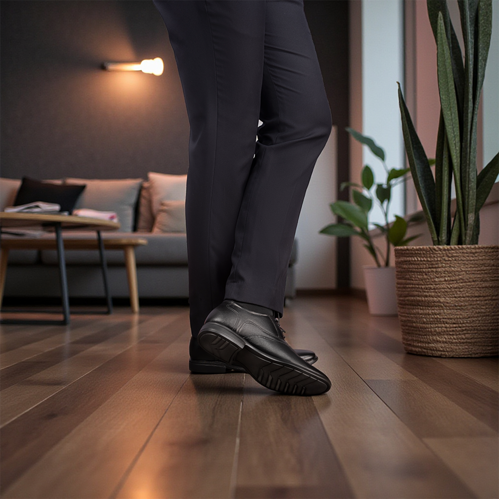 Giày Độn Nam T82 Đen - Màu: Đen - Chất liệu:     + Đế: Cao su đúc.     + Quai: Da bò nappa cao cấp, dày 1,4-1,6mm.     + Lót tăng chiều cao: EVA siêu nhẹ không phân hủy.     + Lớp lót đệm giày độc quyền T&TRA có tính đàn hồi cao.     + Lót hông: Lót da. - Tăng cao 8cm: Đế ngoài 3cm, phần cao ẩn bên trong 5cm. - Thiết kế và sản xuất: T&TRA, Việt Nam. - Công nghệ chống dốc: Độ dốc tương đương mẫu cao 6cm KHÔNG thiết kế chống dốc. - Sản phẩm miễn phí ship toàn quốc.