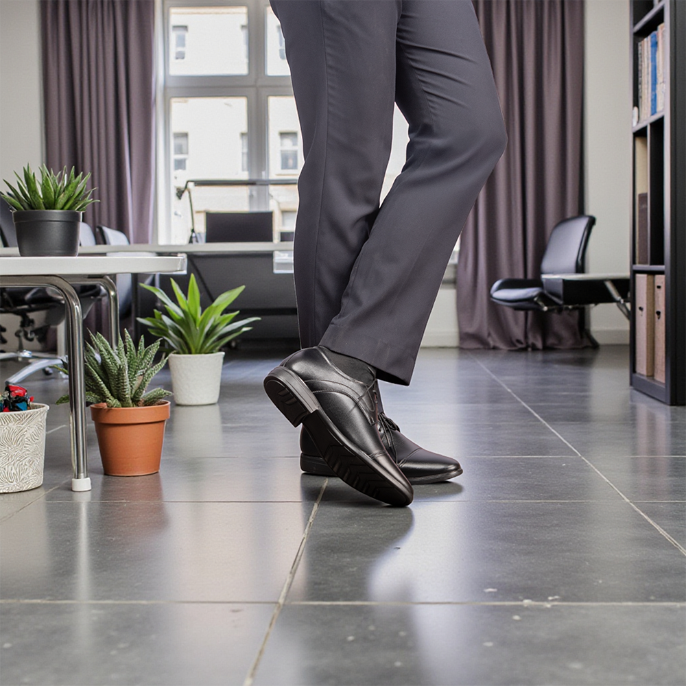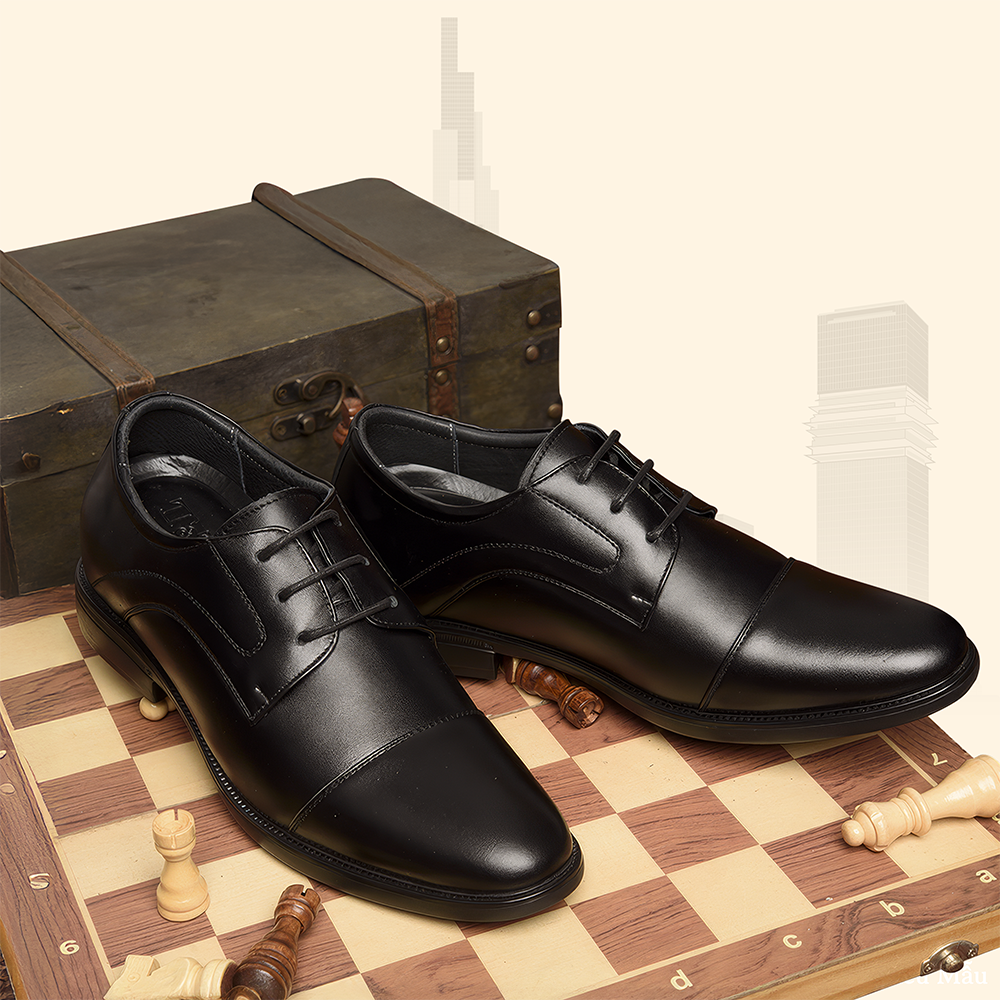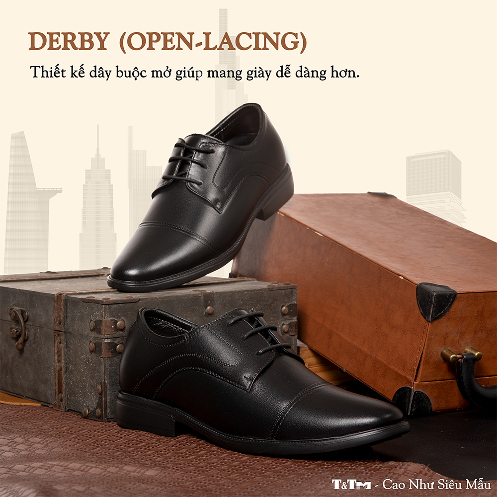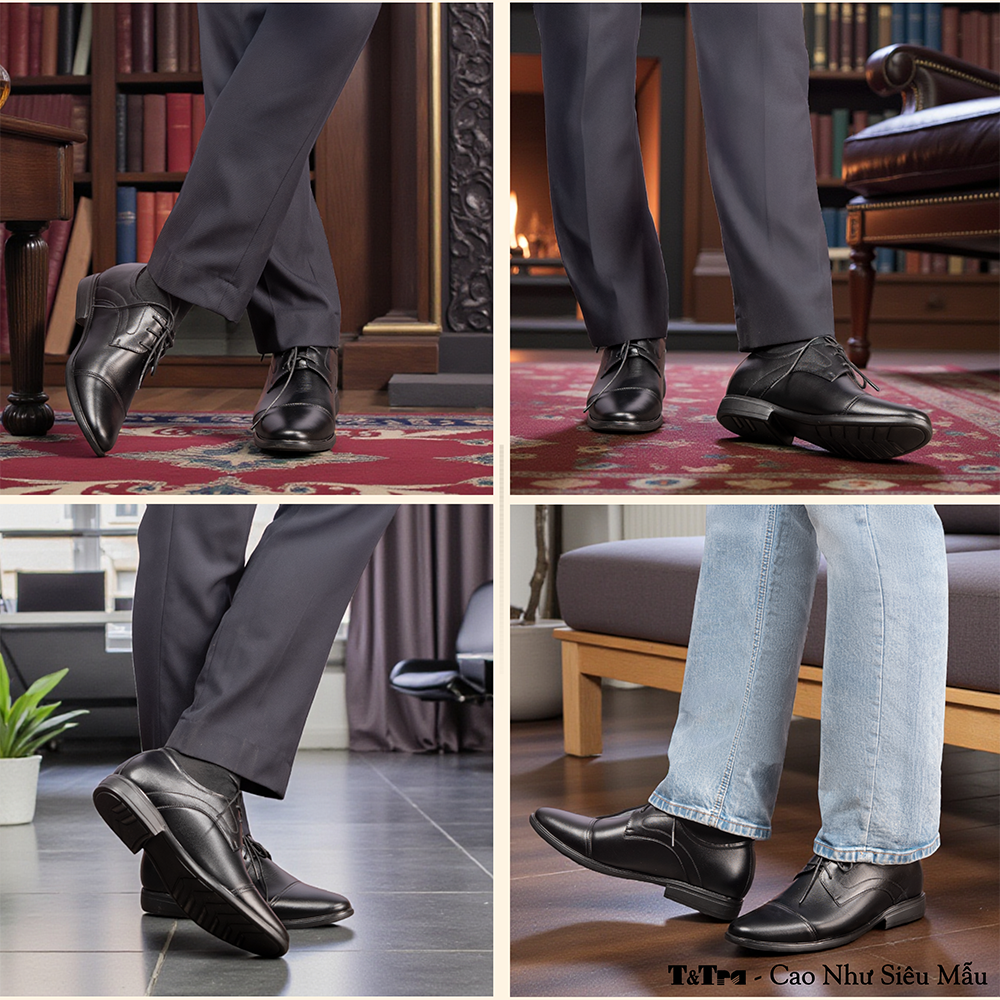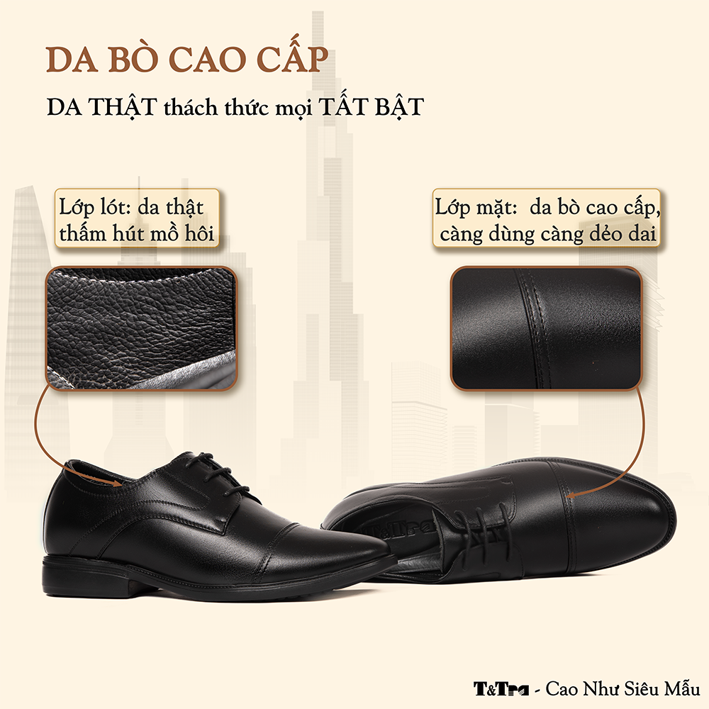 Giày Cao Nam T81 Đen - Màu: Đen - Chất liệu:    + Đế: Cao su đúc.    + Quai: Da bò nappa cao cấp, dày 1,4-1,6mm    + Lót tăng chiều cao: EVA siêu nhẹ không phân hủy.    + Lớp lót đệm giày độc quyền T&TRA có tính đàn hồi cao.    + Lót hông: Lót da. - Tăng cao 8cm: Đế ngoài 3cm, phần cao ẩn bên trong 5cm. - Thiết kế và sản xuất: T&TRA, Việt Nam. - Công nghệ chống dốc: Độ dốc tương đương mẫu cao 6cm KHÔNG thiết kế chống dốc. - Sản phẩm miễn phí ship toàn quốc.