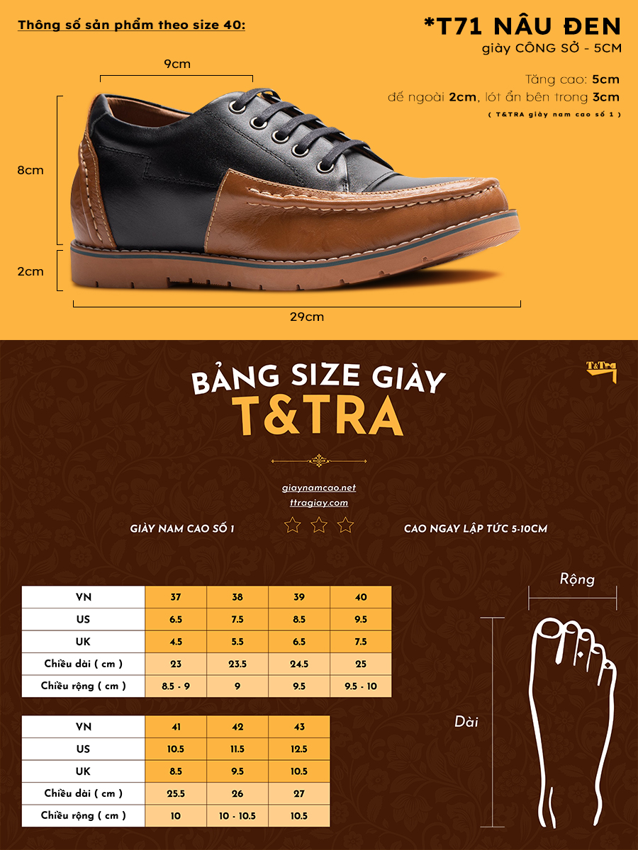 Giày tăng chiều cao nam T&TRA hân hạnh được phục vụ quý khách. Chúng tôi luôn luôn lắng nghe ý kiến đóng góp từ quý khách hàng để từ đó hoàn thiện tốt hơn. Sự tin tưởng của quý khách hàng là động lực phát triển của chúng tôi.