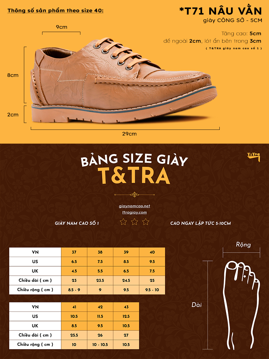 Giày tăng chiều cao nam T&TRA hân hạnh được phục vụ quý khách. Chúng tôi luôn luôn lắng nghe ý kiến đóng góp từ quý khách hàng để từ đó hoàn thiện tốt hơn. Sự tin tưởng của quý khách hàng là động lực phát triển của chúng tôi.