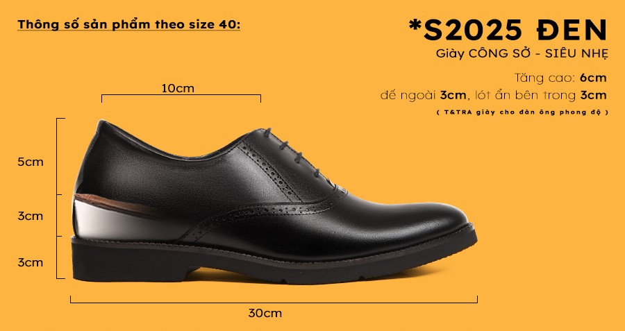 - Tăng cao 6cm: Đế ngoài 3cm, phần cao ẩn bên trong 3cm.