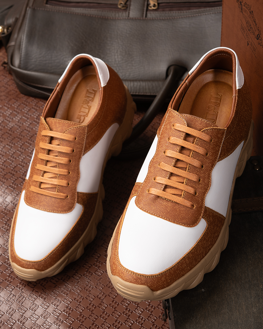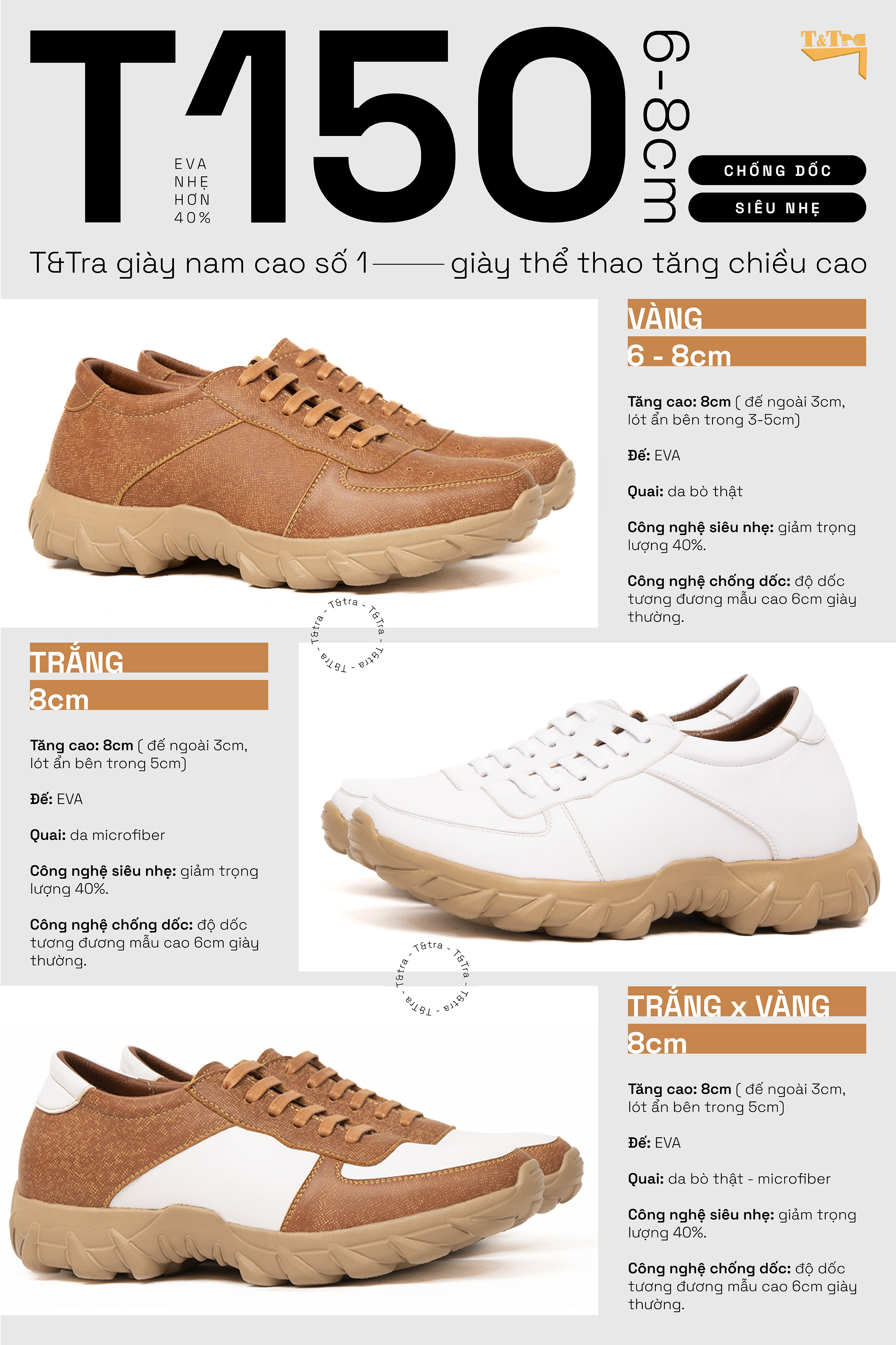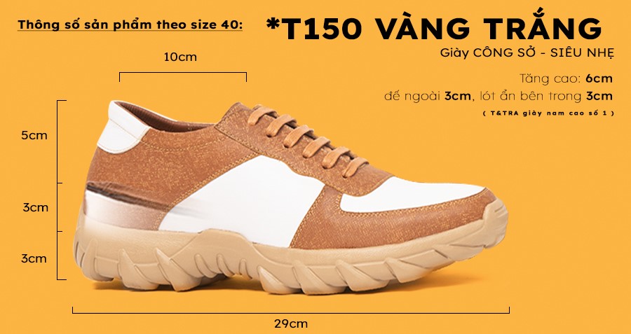 - Trọng lượng giày cao nam T150 Trắng Vàng nhẹ hơn 18% (so với dùng đế cao su) do dùng đế và lót tăng cao bằng vật liệu EVA.