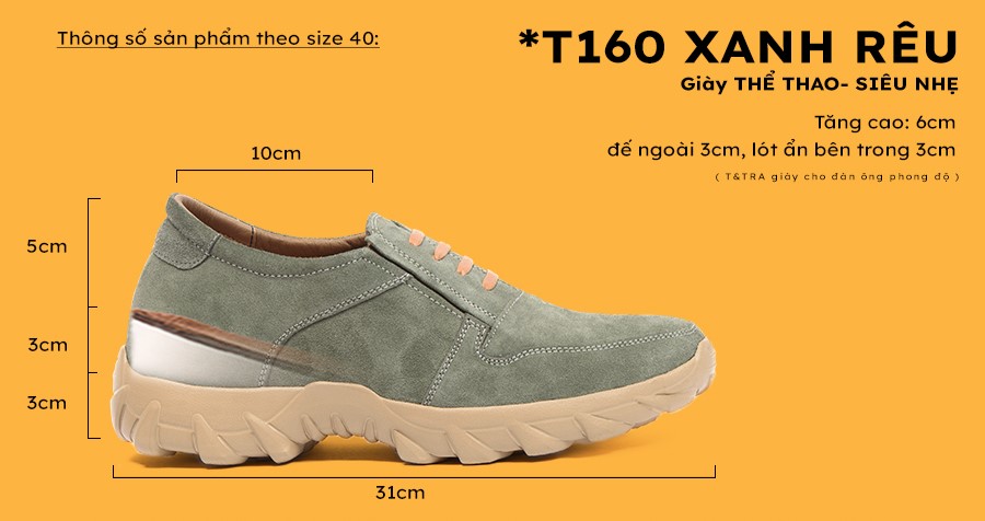 - Điểm đáng quan tâm nhất khi sản xuất và sử dụng giày cao nam T160 Xanh Rêu là độ dốc bàn chân khi sử dụng. Đặc biệt là những đôi giày có chiều cao lớn từ 8cm trở lên.