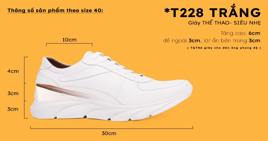 - Điểm đáng quan tâm nhất khi sản xuất và sử dụng giày đế cao nam T228 Trắng là độ dốc bàn chân khi sử dụng. Đặc biệt là những đôi giày có chiều cao lớn từ 8cm trở lên.