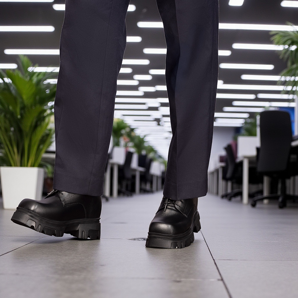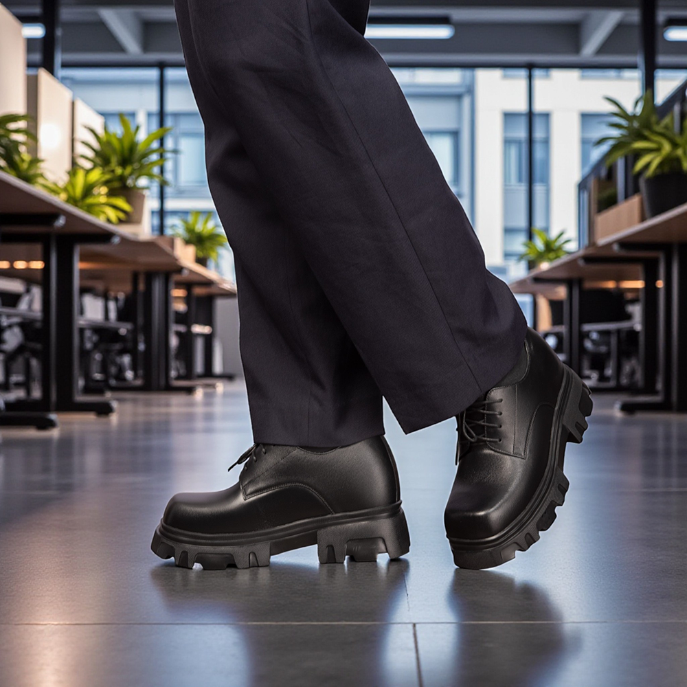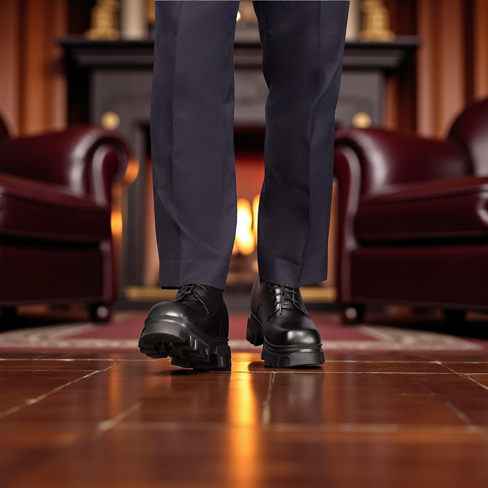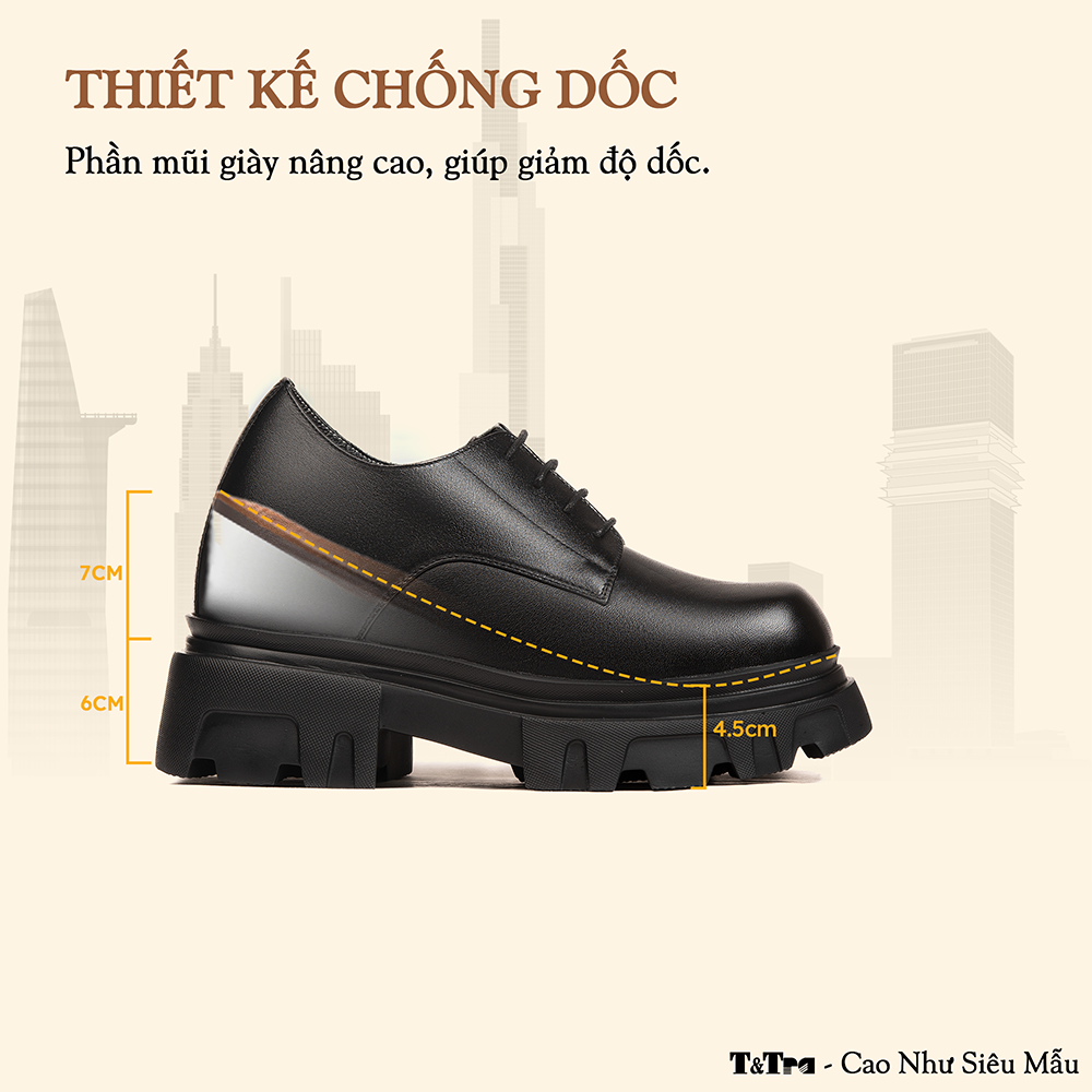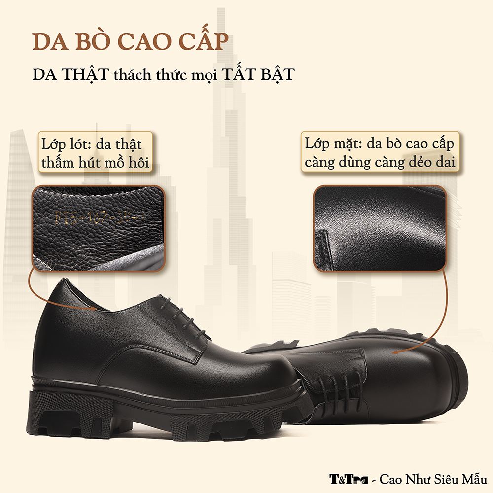 Giày Cao Nam T81 Đen - Màu: Đen - Chất liệu:    + Đế: Cao su đúc.    + Quai: Da bò nappa cao cấp, dày 1,4-1,6mm    + Lót tăng chiều cao: EVA siêu nhẹ không phân hủy.    + Lớp lót đệm giày độc quyền T&TRA có tính đàn hồi cao.    + Lót hông: Lót da. - Tăng cao 8cm: Đế ngoài 3cm, phần cao ẩn bên trong 5cm. - Thiết kế và sản xuất: T&TRA, Việt Nam. - Công nghệ chống dốc: Độ dốc tương đương mẫu cao 6cm KHÔNG thiết kế chống dốc. - Sản phẩm miễn phí ship toàn quốc.