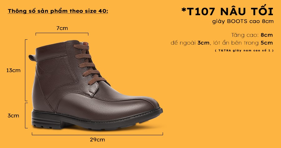 - Tăng cao 8cm: Đế ngoài 3cm, phần cao ẩn bên trong 5cm