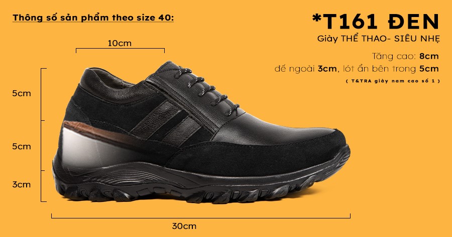 - Trọng lượng giày cao nam T161 Đen nhẹ hơn 18% (so với dùng đế cao su) do dùng đế và lót tăng cao bằng vật liệu EVA.