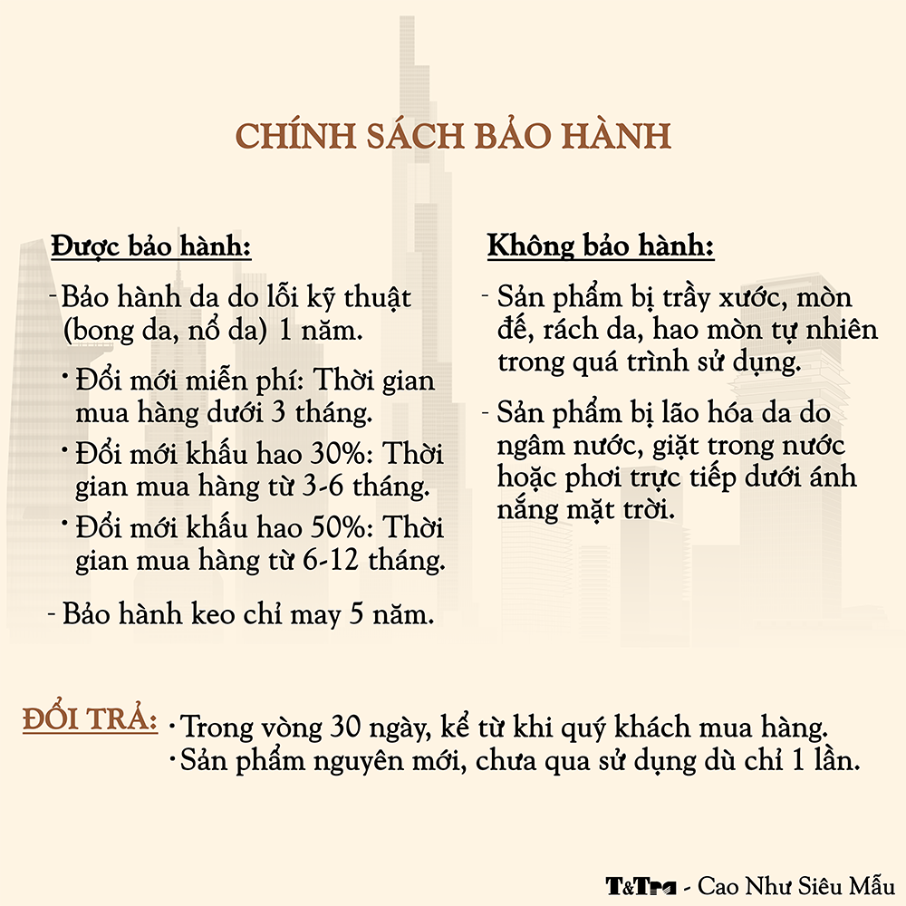 - Lưu ý sử dụng sản phẩm: không giặt hoặc ngâm sản phẩm trong nước, không phơi hoặc để giày trực tiếp dưới ánh nắng mặt trời trong thời gian dài vì sẽ làm da bị lão hóa, giảm chất lượng của sản phẩm. T&TRA sẽ không bảo hành trong các trường hợp này