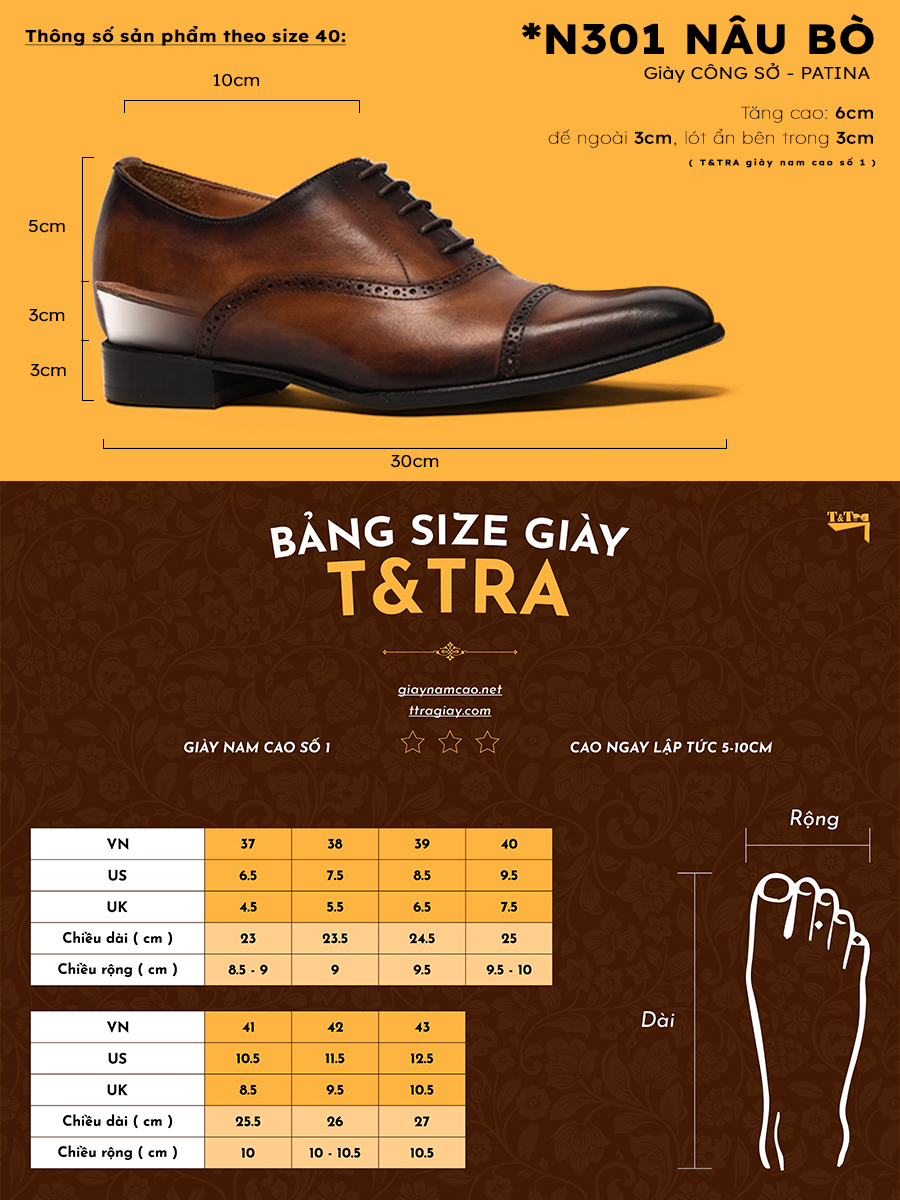 Giày tăng chiều cao nam T&TRA hân hạnh được phục vụ quý khách. Chúng tôi luôn luôn lắng nghe ý kiến đóng góp từ quý khách hàng để từ đó hoàn thiện tốt hơn. Sự tin tưởng của quý khách hàng là động lực phát triển của chúng tôi.
