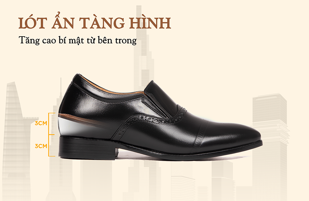 - Sản phẩm tích hợp tính năng tăng chiều cao kép gồm đế ngoài 3cm và lót ẩn 3cm, nâng tổng chiều cao lên đến 6cm