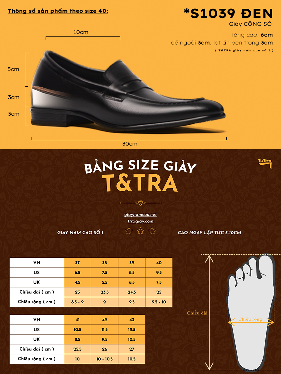 Giày tăng chiều cao nam T&TRA hân hạnh được phục vụ quý khách. Chúng tôi luôn luôn lắng nghe ý kiến đóng góp từ quý khách hàng để từ đó hoàn thiện tốt hơn. Sự tin tưởng của quý khách hàng là động lực phát triển của chúng tôi.